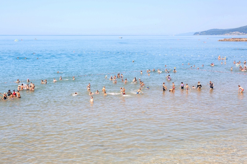 Песчано-галечный с отмелью до 30 м, подход к которому осуществляется через подземный переход. На территории пляжа медицинский и спасательный пункты, теневые навесы, кабинки для переодевания, душ, туалет, ногомойки (на территории ОК)